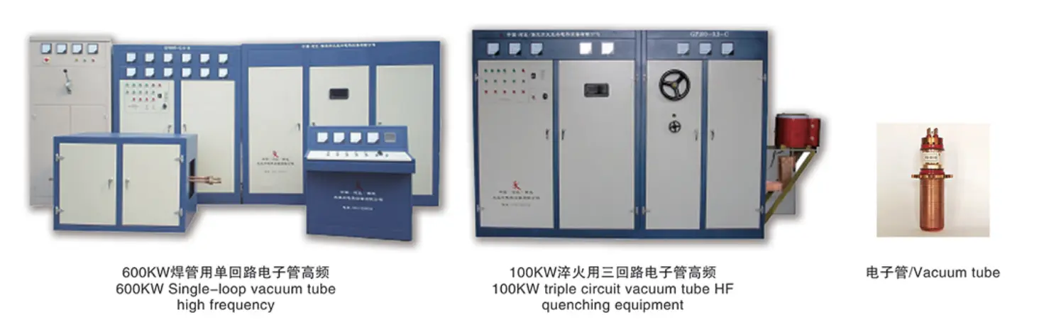 Tiontaítear AC tionsclaíoch gnáth (trí chéim ceithre shreang 380V/50HZ sa tSín) go AC inchoigeartaithe ó 0 go 380V (minicíocht gan athrú) trí rialtóir voltais thyristor AC, agus ansin é a ardú go dtí beagnach 10000V ardvoltais (minicíocht gan athrú) ag claochladán, agus ansin ceartaítear an voltas ard na mílte voltas ard ascalaithe le feadán bhfolús go HF agus HV reatha, agus ansin trí athshondas comhthreomhar LC chun sruth ascalach a mhéadú, agus tar éis laghdú voltais a sholáthar don ionduchtóir a úsáidtear chun píopaí cruach agus píosaí oibre eile a théamh, etc.