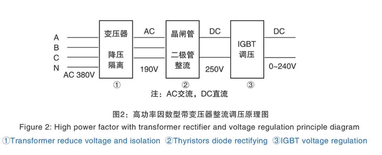 1. Aicmithe trí rialáil voltais a cheartú: Is féidir thyristors (SCR) a úsáid chun ceartú comhuaineach agus rialú voltais a chur i gcrích, nó dé-óid nó thyristor a úsáid ar dtús ag ceartú agus ansin IGBT a úsáid chun voltas a rialáil. Úsáid IGBT rialáil voltas é chun feabhas a chur ar threalamh factor.can leictreachas a shábháil agus cáilíocht táthú a fheabhsú tuilleadh.